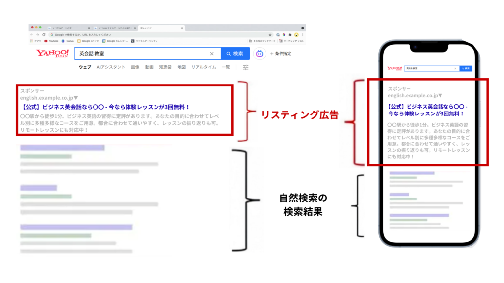 リスティング広告は、GoogleやYahoo!などの検索エンジンで、ユーザーが入力したキーワードに合わせて表示される広告を指します。