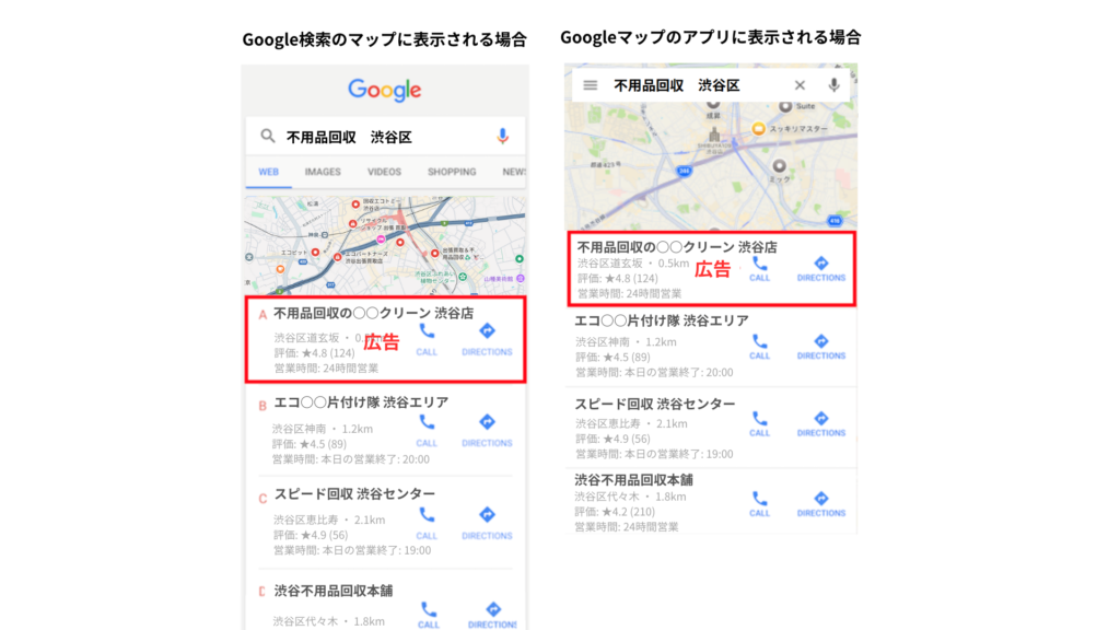 リスティング広告は、GoogleやYahoo!などの検索エンジンで、たとえばユーザーが「不用品回収 〇〇(地域名)」と検索した際に、その検索結果画面に自社の広告を優先的に表示させる方法です。