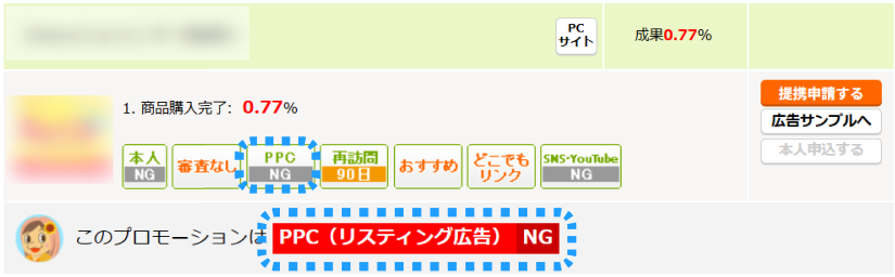 アフィリエイトサービスを利用する際、上図のように「リスティングNG」と表記されたプログラムを目にすることがあります。これは、キーワードの種類に関わらず、リスティング広告を出すこと自体が禁止されている案件を指します。