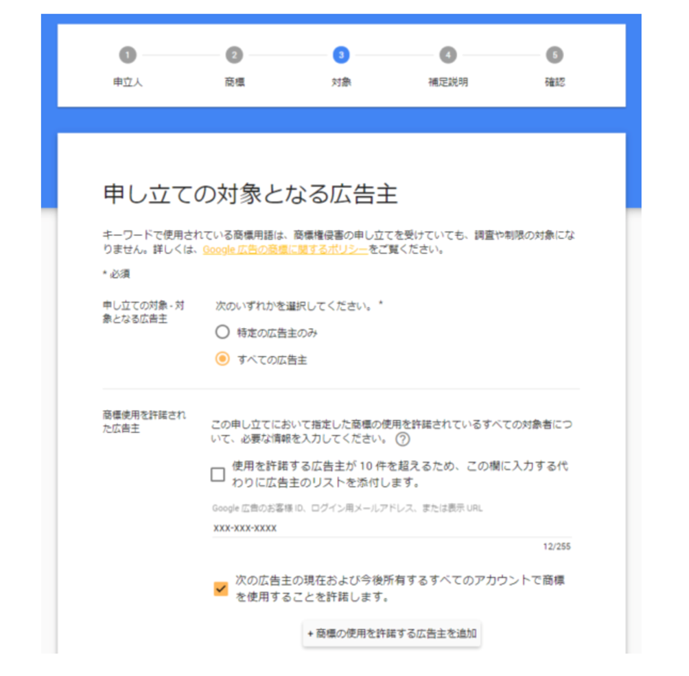 申し立てには、メールアドレス、商標登録番号、使用制限または許諾する広告主の情報などが必要となります。