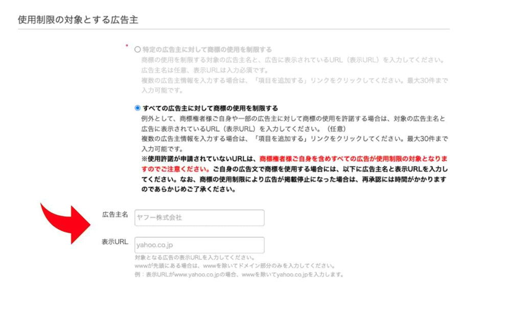 Yahoo!広告もGoogle広告と同様に、下図のように特定の広告主に対して商標の使用を許諾しておきましょう。