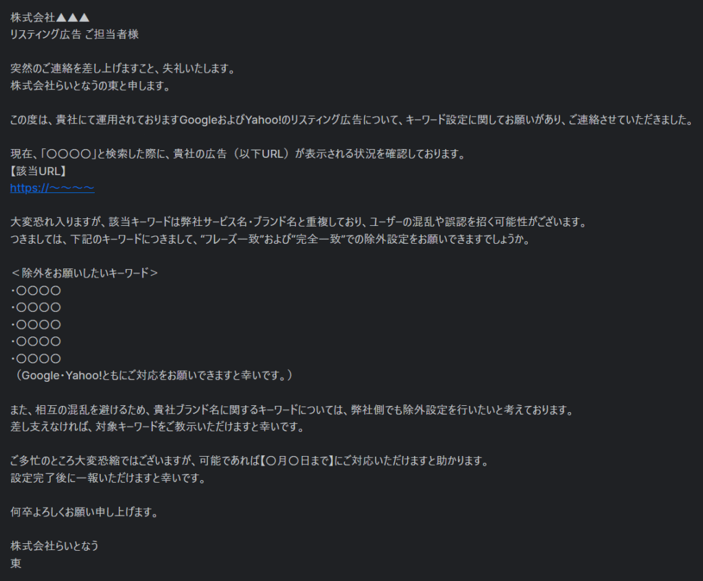 除外キーワードの登録を依頼するなど、具体的な対応策を提示することで、相手側も対応しやすくなります。
