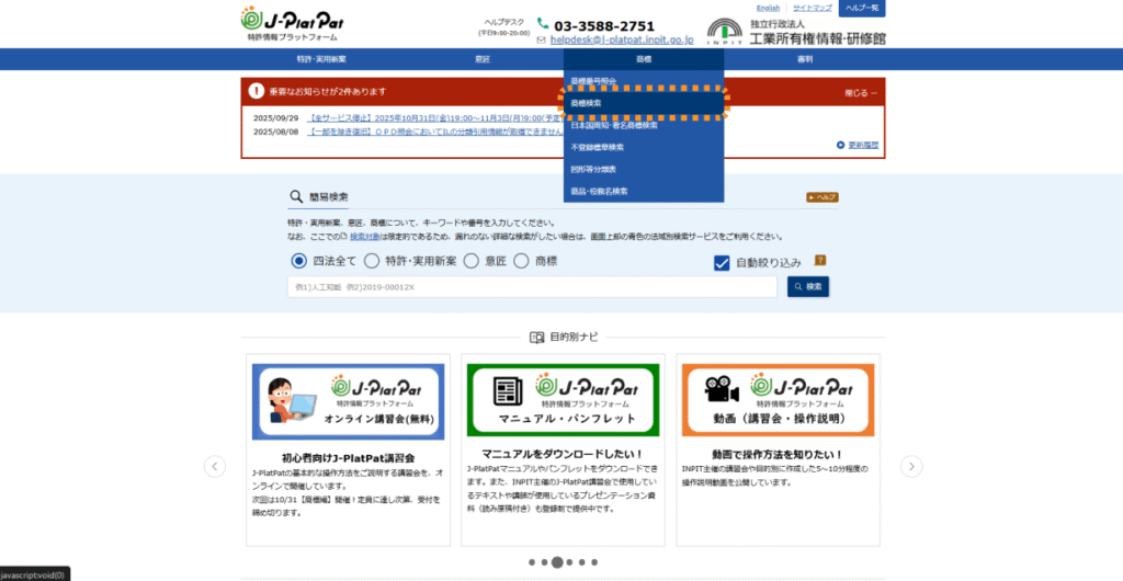 次に、ヘッダーメニューより『商標検索』をクリックします。