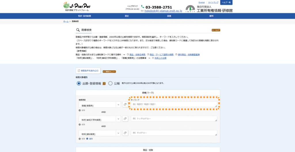 検索キーワード欄に調べたい商標名を入力し、画面下部にある『検索』ボタンをクリックします。