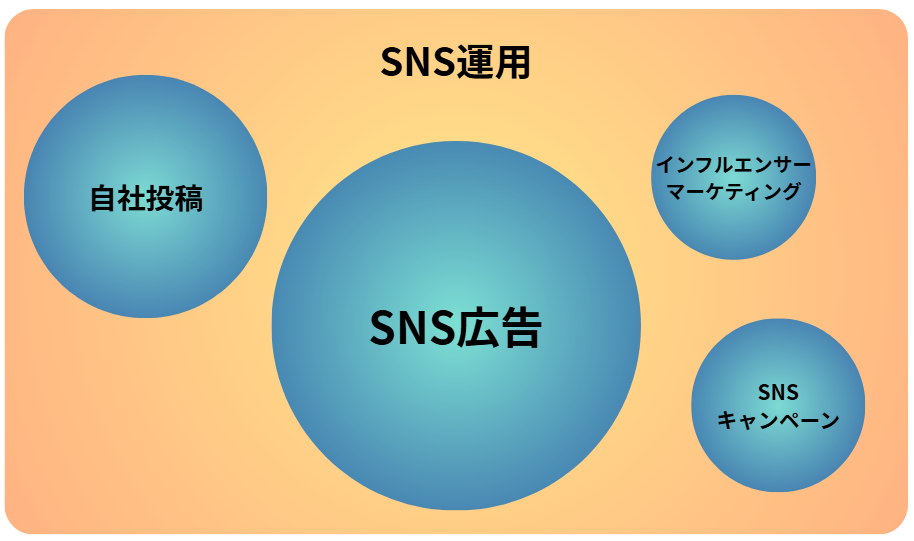広義では、下図のようにSNS広告運用はSNS運用という大きな枠組みの中に含まれる施策の一つと捉えられます。